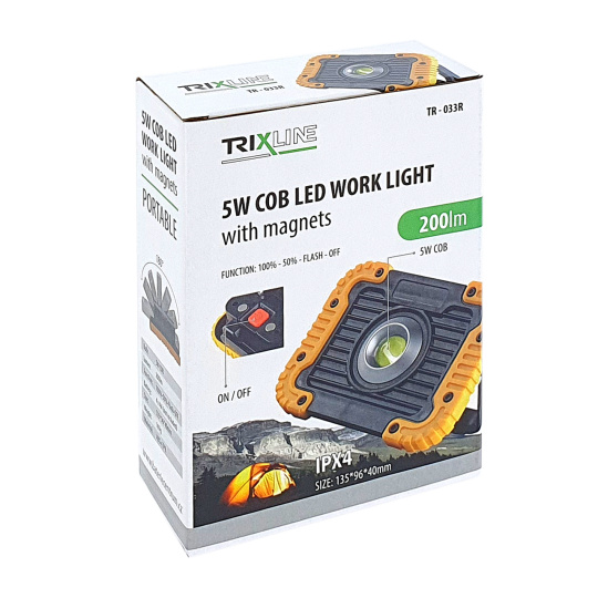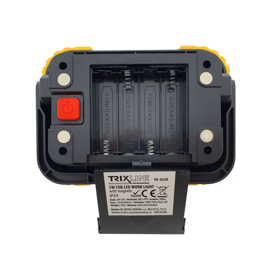 Pracownicza latarka COB LED TR-033R Trixline ma 3 tryby świecenia 100%/50% i migotanie. Zasilana za pomocą 4xAA LR6 baterii alkalicznych (nie są dołączone do zestawu). Stopień ochrony IPX4 chroniony przed rozpryskami wody. Zapięcie z tyłu latarki. Można zamocować magnetycznie lub położyć i dostosować wysokość nachylenia.