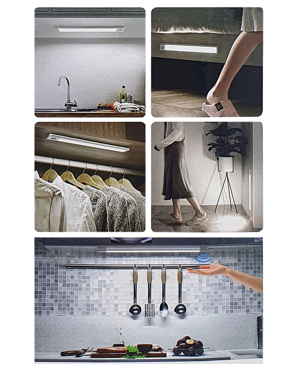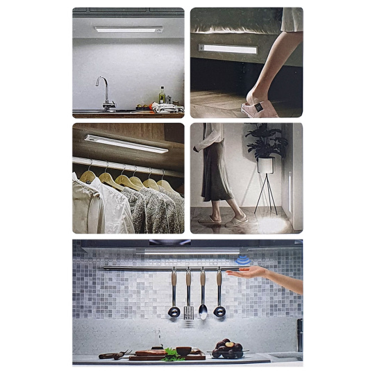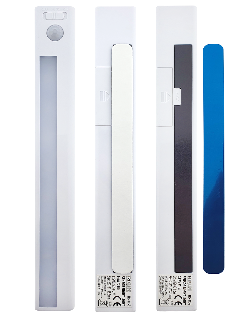 Automatyczne włączanie światła działa tylko w ciemności. Nie włącza się przy jasnym świetle i w ciągu dnia. Na tylnej stronie znajdują się 2 magnetyczne paski. Jeden wyposażony w dwustronną taśmę klejącą, a drugi zamocowany w świetle. Czujnikowe światło nocne można łatwo przymocować np. do szafy, na półki, rama łóżka, schody, pod blat kuchenny itp. Zasilane za pomocą 4xAAA mikropaluszki alkaliczne (nie są dołączone do zestawu).