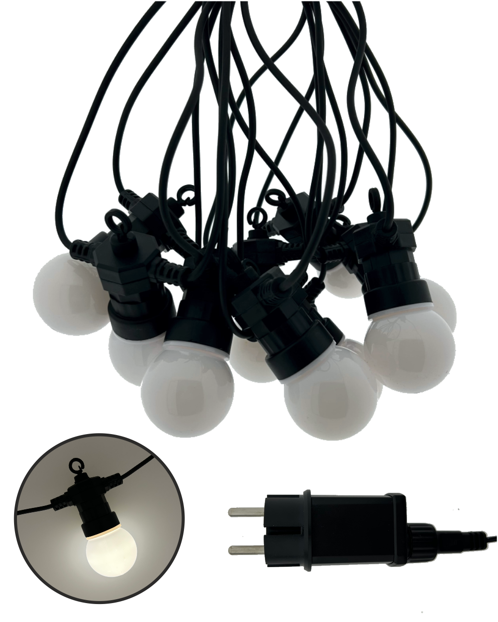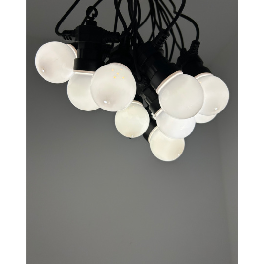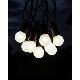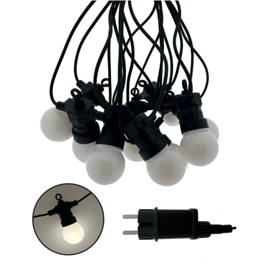 Ten łańcuch świetlny zawiera 10 stylowych żarówek, z których każda skrywa 5 diod LED o ciepłej białej barwie (2700K) – w sumie 50 diod LED na całkowitej długości 8 metrów.Solidna konstrukcja z tworzywa sztucznego z klasą ochrony IP44 zapewnia odporność na warunki atmosferyczne, co czyni ją idealną do użytku na zewnątrz. Łańcuch świetlny jest zasilany z sieci (220–240V) i ma bezpieczne wyjście 24V DC / 3,6W. Dzięki 3,5-metrowemu kablowi zasilającemu instalacja jest łatwa i elastyczna.