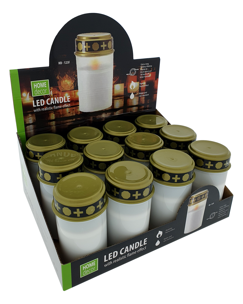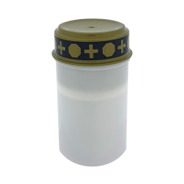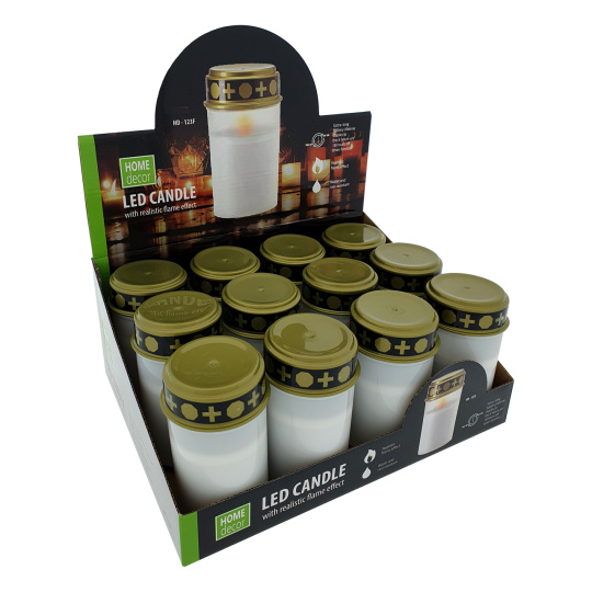 Cmentarna świeca LED HD-122F HOME decor z realistycznym pomarańczowym migoczącym płomieniem. Zaletą jest timer, świeca świeci przez 6 godzin. Po 18. godzinach zapalą się ponownie w tym samym czasie. W opakowaniu znajduje się wyjmowana biała świeca LED. Na pokrywie świecy przełącznik ON/OFF. Po otwarciu świecy włóż 2xC R14 baterie (nie są dołączone do zestawu). Odpowiednia alternatywa dla klasycznej świecy. Łatwe i bezpieczne użytkowanie bez ryzyka pożaru.