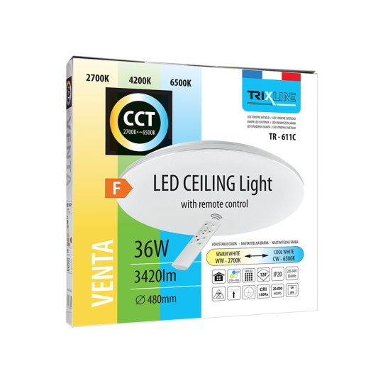 Zawartość opakowania: LED sufitowa lampa TR-611C - VENTA, pilot (2xAAA baterie nie są w zestawie), 4x śrubki (długość 2,5cm, krzyżowe nacięcie), 4x kołki rozporowe (długość 2,5cm), instrukcja obsługi