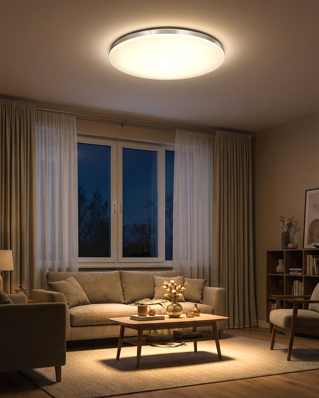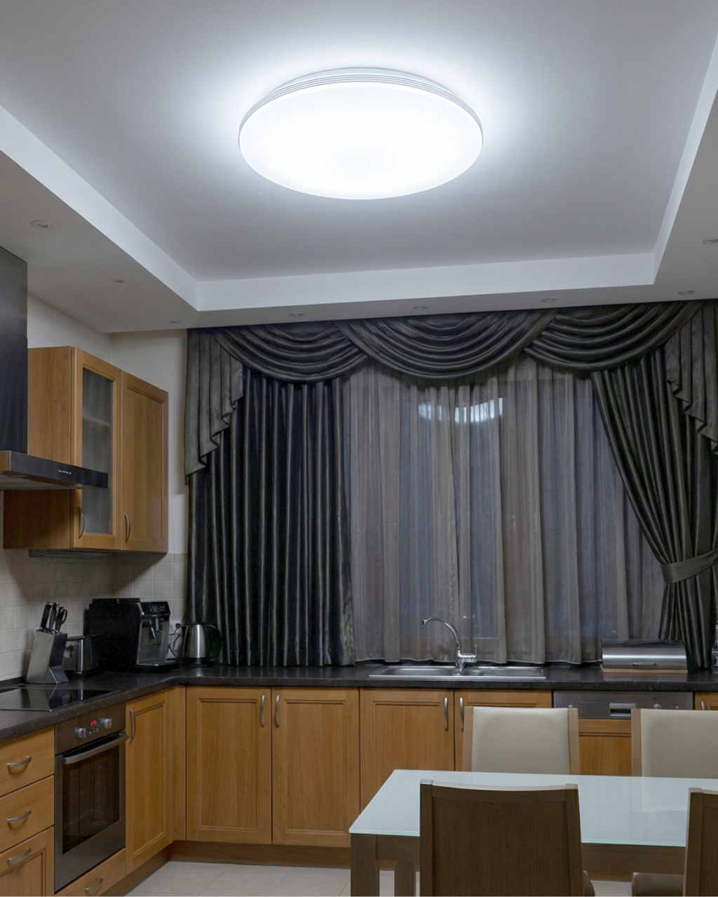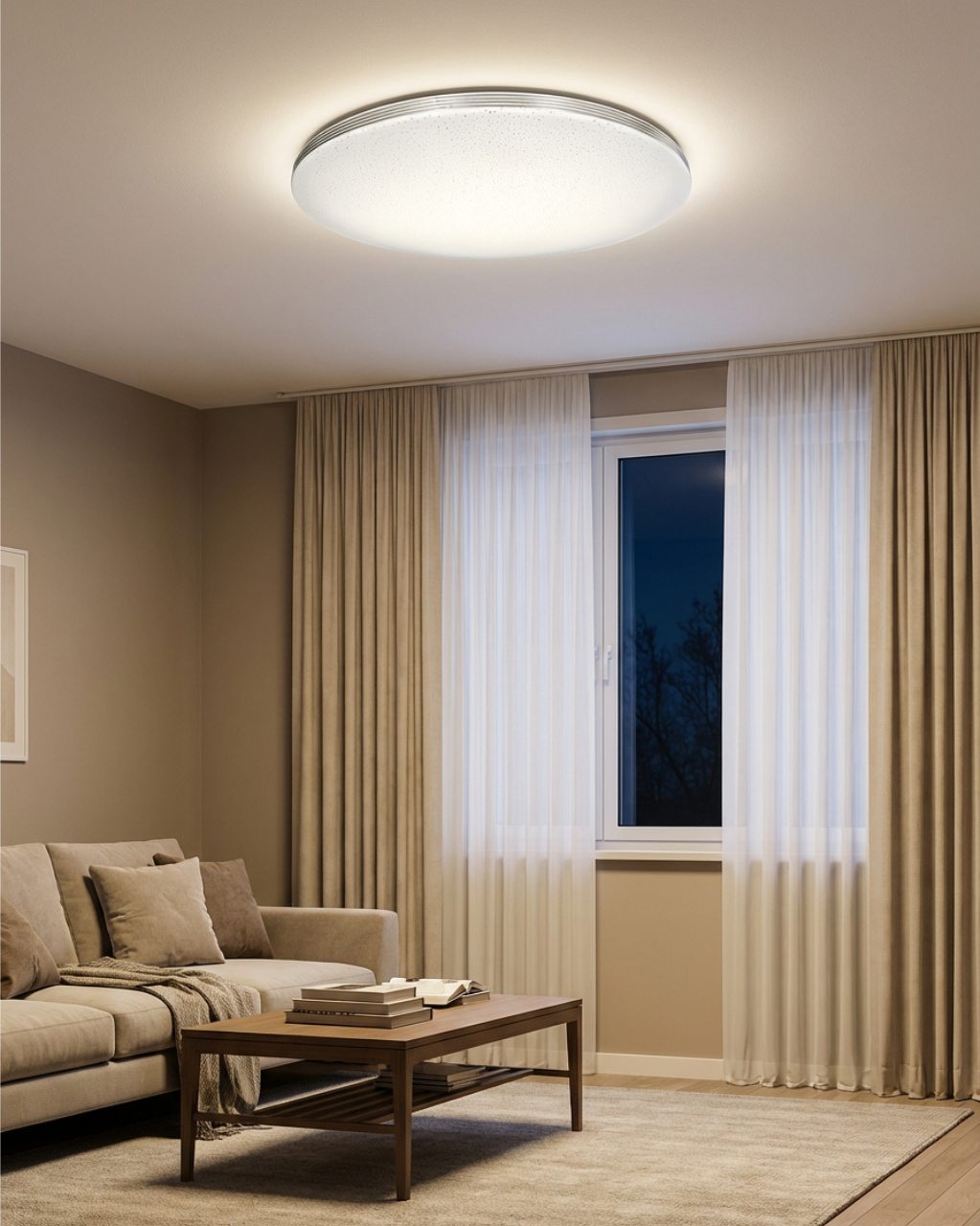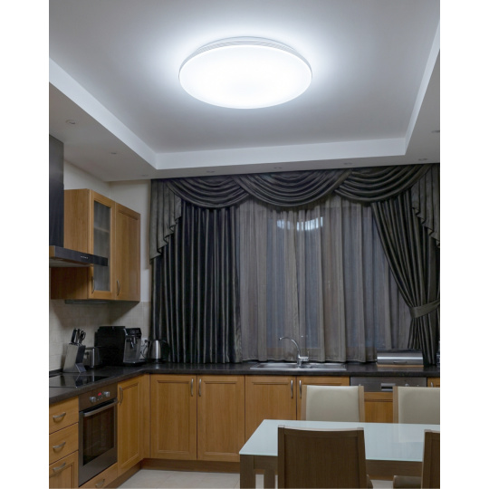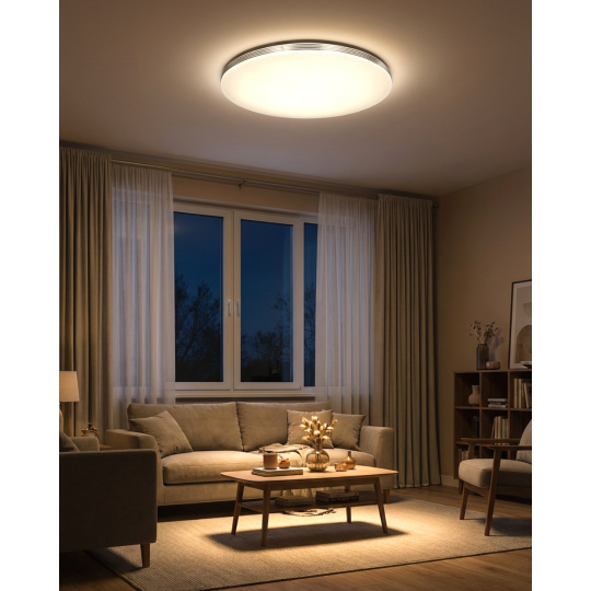 LED sufitowa lampa TR-613C - LIKA Trixline w białym kolorze z czterema srebrnymi paskami na obwodzie i błyszczącym efektem świetlnym.Oprawa ma zmienny design, w którym można zdjąć srebrne paski i pozostawić jedynie czysto białe krawędzie. Jest przeznaczone do wnętrz, takich jak salony, sypialnie, hale, biura, korytarze i podobne miejsca. Za pomocą dołączonego pilota możesz przełączać się między trzema temperaturami barwowymi w zakresie od 2700K do 6500K, które można ściemniać według potrzeb, aby stworzyć przyjemną atmosferę. Przy maksymalnym przyciemnieniu zużycie spada do zaledwie 14W z pierwotnych 80W, co gwarantuje oszczędność energii.Inną opcją na pilocie jest tryb nocny oraz funkcja 30 sekund, po upływie których lampa LED wyłączy się automatycznie. Po wyłączeniu lampa zapamiętuje ostatni ustawiony tryb, co zapewnia wygodne i intuicyjne użytkowanie.