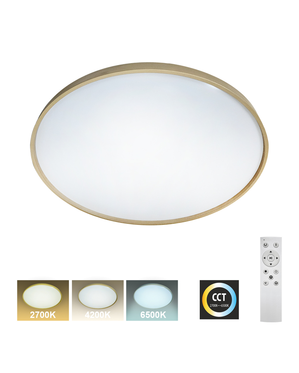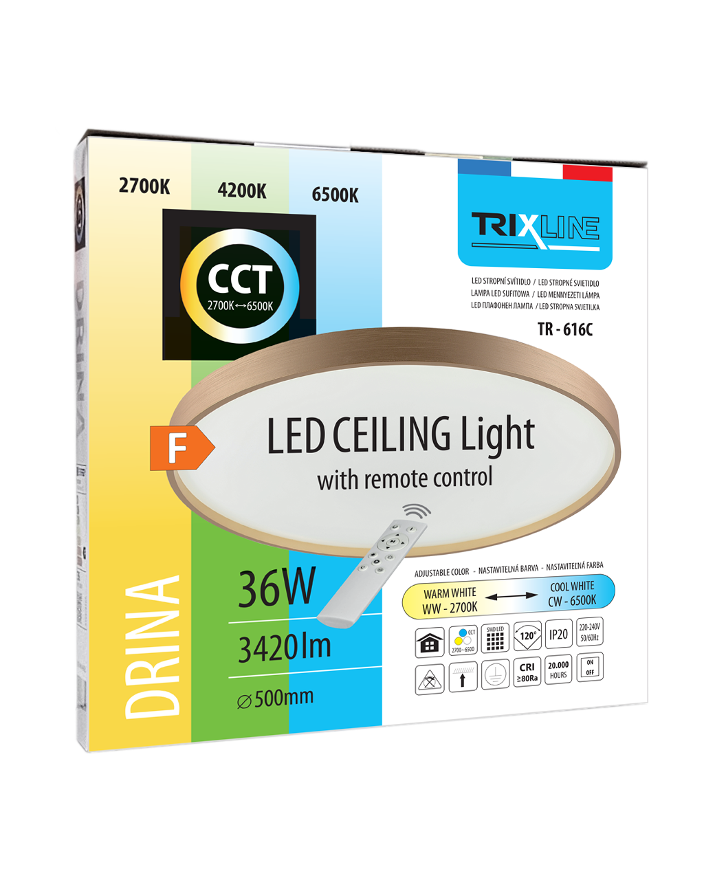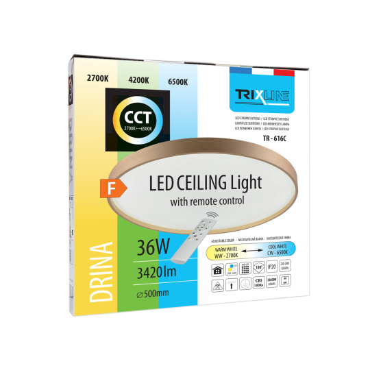 LED sufitowa lampa TR-616C - DRINA Trixline w złotym kolorze jest przeznaczona do wnętrz takich jak salony, sypialnie, hale, biura, korytarze i podobne miejsca. Za pomocą dołączonego pilota możesz przełączać się między trzema temperaturami barwowymi w zakresie od 2700K do 6500K, które można ściemniać według potrzeb, aby stworzyć przyjemną atmosferę. Przy maksymalnym przyciemnieniu zużycie spada do zaledwie 6W z pierwotnych 36W, co gwarantuje oszczędność energii.Inną opcją na pilocie jest tryb nocny oraz funkcja 30 sekund, po upływie których lampa LED wyłączy się automatycznie. Po wyłączeniu lampa zapamiętuje ostatni ustawiony tryb, co zapewnia wygodne i intuicyjne użytkowanie.