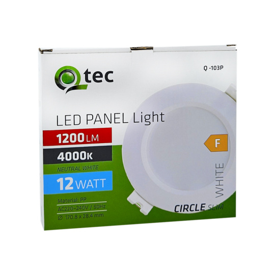 Okrągły wpuszczany panel LED Qtec Q-103P o mocy 12W z strumieniem świetlnym 1200lm i neutralną białą barwą światła 4000K.
