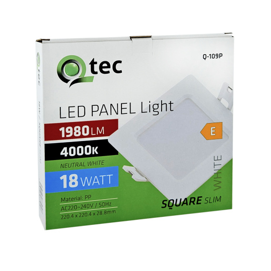 Kwadratowy wpuszczany panel LED Qtec Q-109P o mocy 18W z strumieniem świetlnym 1980lm i neutralną białą barwą światła 4000K.