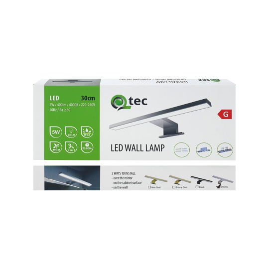 Zaletą oświetlenia ściennego do łazienki Q-302CH Qtec 5W jest nowoczesny design, wysoka jakość wykonania, stopień ochrony IP44 umożliwia instalację światła w pomieszczeniach o podwyższonej wilgotności, np. łazienki, 3w1 sposoby montażu na lustro, szafkę lub ścianę. Źródłem światła są energooszczędne diody LED, które emitują neutralne białe światło o barwie 4000K, przyjemne dla oczu. Oświetlenie łazienkowe oferujemy w 4 wariantach kolorystycznych - matowe złote - błyszczące złote - czarne - chrom.