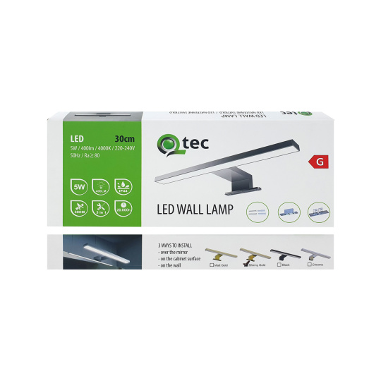 Zaletą oświetlenia ściennego do łazienki Q-304G Qtec 5W jest nowoczesny design, wysoka jakość wykonania, stopień ochrony IP44 umożliwia instalację światła w pomieszczeniach o podwyższonej wilgotności, np. łazienki, 3w1 sposoby montażu na lustro, szafkę lub ścianę. Źródłem światła są energooszczędne diody LED, które emitują neutralne białe światło o barwie 4000K, przyjemne dla oczu. Oświetlenie łazienkowe oferujemy w 4 wariantach kolorystycznych - matowe złote - błyszczące złote - czarne - chrom.