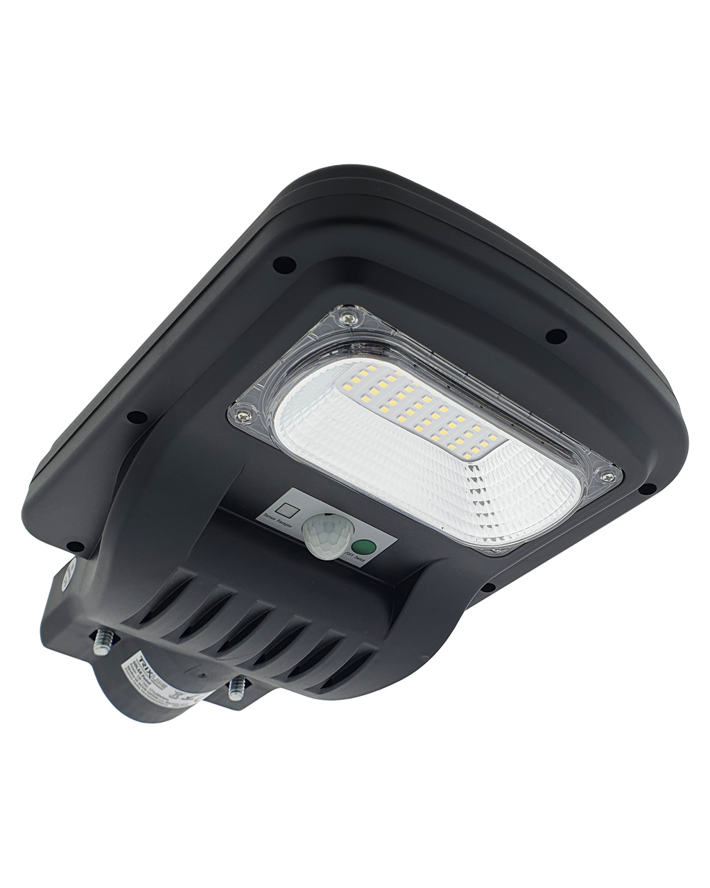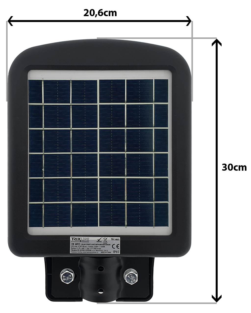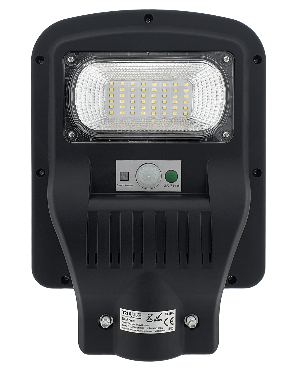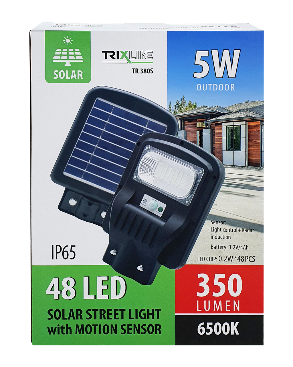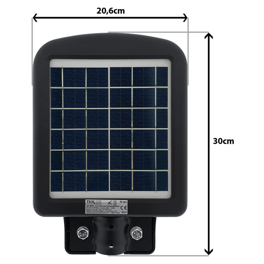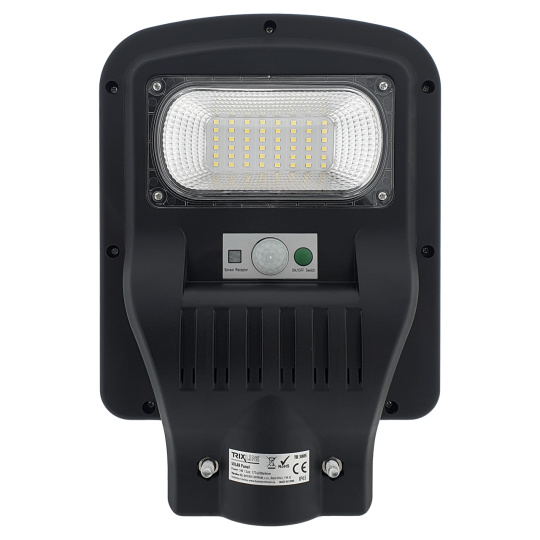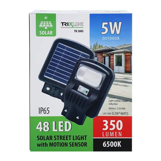 Solarny lampa uliczna TR 380S Trixline 5W z czujnikiem ruchu. Panel słoneczny jest częścią tylnej strony światła. Instalacja na tyczce pod kątem 40-70°. Zaletą jest stopień ochrony IP65, co gwarantuje ochronę przed strumieniami wody z wszystkich kątów oraz odporność na wnikanie kurzu. Odpowiednie do oświetlenia ogrodu, chodnika domu jednorodzinnego lub podjazdów. Ważne jest, aby panel słoneczny był wystawiony na bezpośrednie działanie słońca przez cały dzień, unikaj skierowania paneli w stronę budynków, drzew i innych przeszkód.