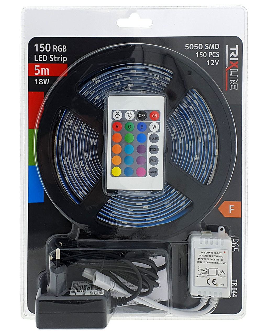 ..Częścią zestawu jest pilot, którym można ustawić 16 kolorów, regulować jasność, migotanie kolorów (flash), tryb przyciemniania światła (strobe), tryb przyciemniania kolorów (fade) oraz tryb płynny (smooth).Parametry: