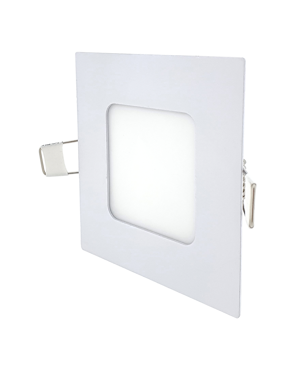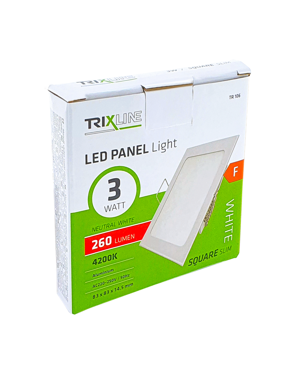 Kwadratowy wpuszczany panel LED Trixline TR-106 o mocy 3W z strumieniem świetlnym 260lm i neutralną białą barwą światła 4200K.