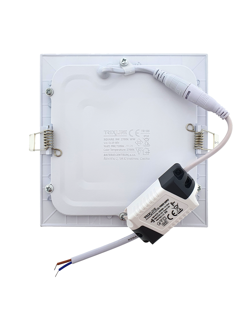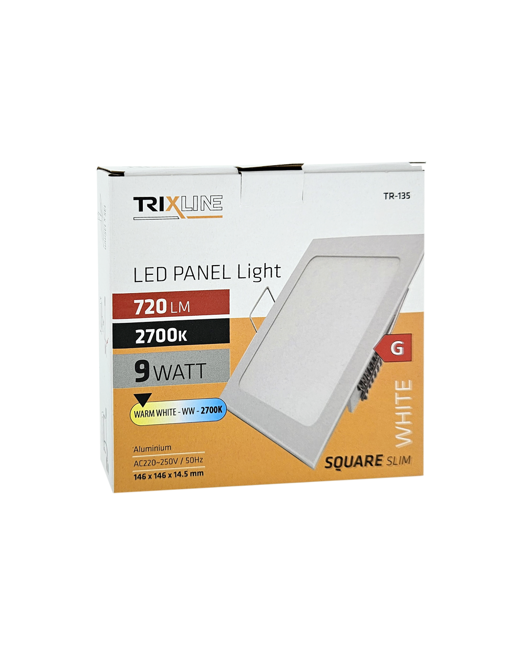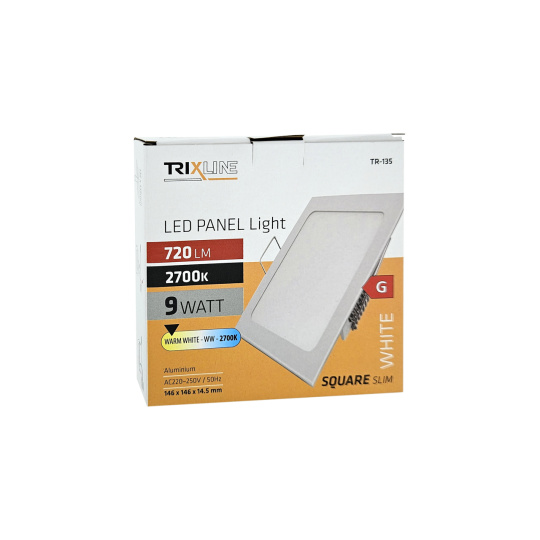 Kwadratowy wpuszczany panel LED Trixline TR-135 o mocy 9W z strumieniem świetlnym 720lm i ciepłą białą barwą światła 2700K.