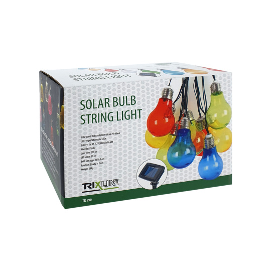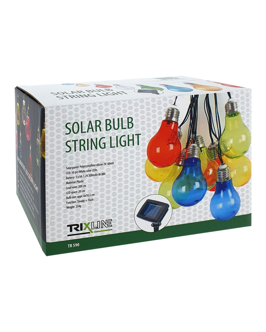 Dekoracyjne LED solarne, oświetlenie zewnętrzne (łańcuch/girlanda) TR-590 Trixline. Tworzy przyjemną atmosferę ogrodu, pergoli, altany, tarasu, balkonu itp. Można swobodnie położyć na stołach, parapetach, półkach lub zawiesić na balustradach, płotach, ścianach, parasolach, drzewach, słupach, owinąć na belkach lub zawiesić pod sufitem czy swobodnie w przestrzeni. Przezroczysty kabel o długości 2m składa się z 10 plastikowych, kolorowych żarówek LED, emitujących białe światło. Zaletą plastikowych żarówek w porównaniu do szklanych jest ich nietłukliwość, odporność, niska waga i dłuższa żywotność. Dzięki panelowi słonecznemu zaoszczędzisz energię i nie jesteś ograniczony podłączeniem do sieci elektrycznej. W ciągu dnia się ładuje, a w nocy świeci. Ma opcjonalne 2 tryby świecenia (S) stały i (F) migający.
