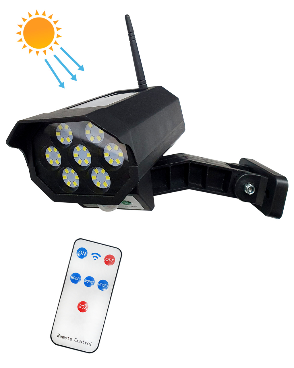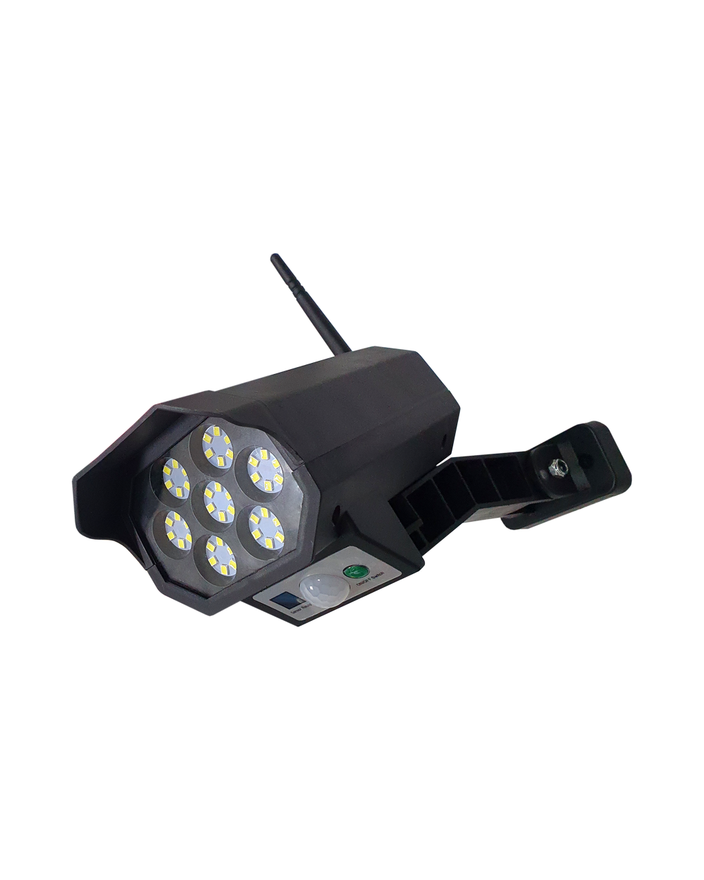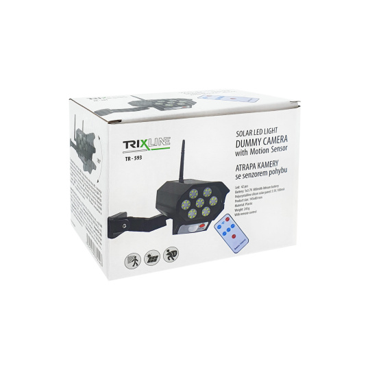 Zewnętrzne wydajne oświetlenie LED 42 szt. SMD TR-593 Trixline - imitacja kamery CCTV ma wbudowany panel słoneczny, czujnik ruchu z detekcją pod kątem 120° i zasięgiem 3-5 m. Czujnik zmierzchowy - ładuje się w dzień, świeci w nocy.Dzięki panelowi słonecznemu zaoszczędzisz energię i nie jesteś ograniczony podłączeniem do sieci elektrycznej. Światło przypomina kamerę, oświetla przestrzeń i tym samym odstrasza ruch niepożądanych osób. Świetny wybór do oświetlenia otoczenia domu, ogrodów, podjazdów, placów budowy, garaży, parkingów, działek rekreacyjnych, domków letniskowych, kempingów itp. Wykonane z wysokiej jakości plastiku o stopniu ochrony IP44. Częścią zestawu jest pilot zdalnego sterowania. Łatwy montaż. Zalecana wysokość instalacji 2-3m nad ziemią.