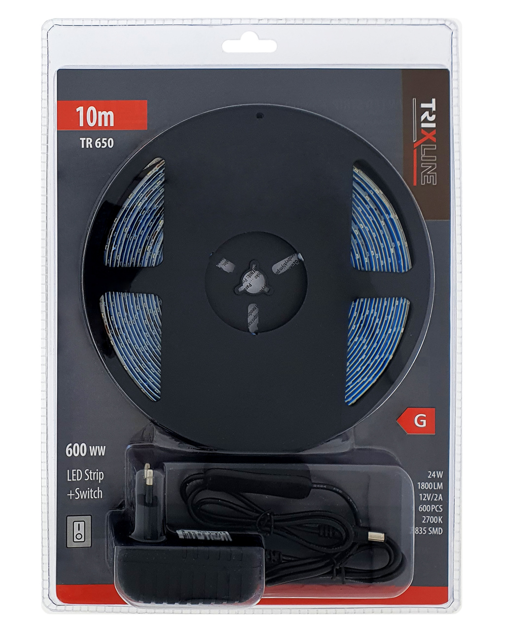 Taśma LED TR 650 Trixline z włącznikiem tworzy unikalną atmosferę wnętrza sypialni, salonu, jadalni, kuchni, gabinetu, pokoju dziecięcego, korytarza itp. Taśma LED ma długość 10 m, składa się z energooszczędnych diod LED w ciepłej białej barwie 2700K, wyposażona jest w dwustronną taśmę samoprzylepną dla łatwej instalacji. Odpowiedni do efektywnego podświetlenia sufitu, mebli lub ścian.