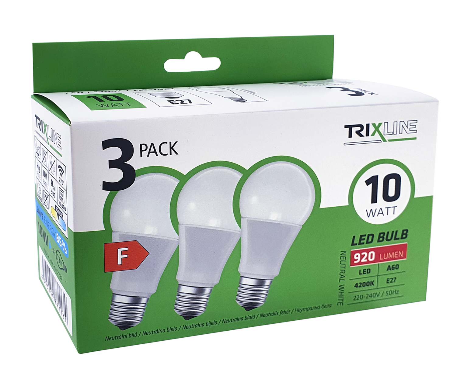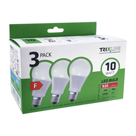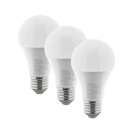 ŻARÓWKI LED TRIXLINE w korzystnym opakowaniu po 3 sztuki. Energooszczędna żarówka LED z gwintem E27 jest przyjazna dla środowiska, nie zawiera rtęci ani ołowiu. W przeciwieństwie do żarówek włóknowych radzi sobie również z ekstremalnie niskimi i wysokimi temperaturami.Jej żywotność sięga aż 30 000 godzin.Dzięki żarówce LED 10W zaoszczędzisz 85% energii, doskonale sprawdzi się jako zamiennik dla klasycznej żarówki 73W. Żarówka LED po włączeniu natychmiast się zapala bez jakiegokolwiek opóźnienia i emituje przyjemne neutralne białe światło 4200K. Żarówkę można używać w kuchni lub łazience, kolor światła jest idealny do miejsc z niedoborem światła dziennego.
