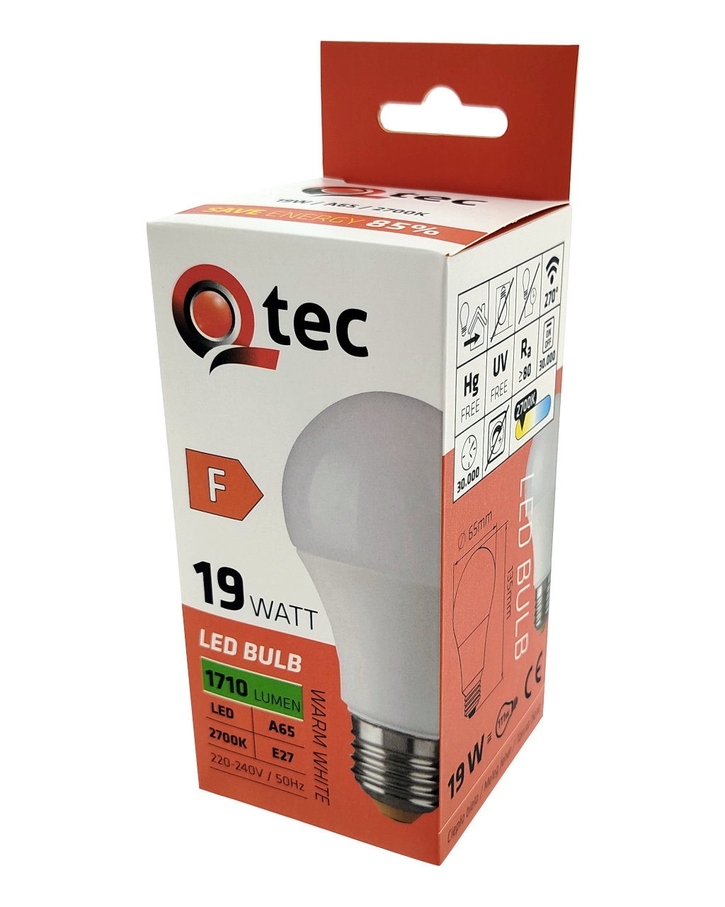 ŻARÓWKA LED Q-tec to oszczędna żarówka LED z gwintem E27, przyjazna dla środowiska, ponieważ nie zawiera rtęci ani ołowiu, a ponadto dobrze sprawdza się zarówno w ekstremalnie niskich, jak i wysokich temperaturach, gdzie żarówki z włóknem często sprawiają problemy. Jej żywotność sięga aż 30 000 godzin. Żarówka LED zapala się natychmiast po włączeniu bez żadnego opóźnienia i emituje przyjemne ciepłe białe światło 2700K.
