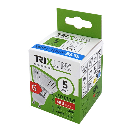 LED REFLEKTOROWA ŻARÓWKA TRIXLINE to oszczędna żarówka LED z trzonkiem GU10, przyjazna dla środowiska, ponieważ nie zawiera rtęci ani ołowiu, a ponadto dobrze sprawdza się zarówno w ekstremalnie niskich, jak i wysokich temperaturach, gdzie żarówki z włóknem często sprawiają problemy.Jej żywotność sięga aż 30 000 godzin.Dzięki swojej mocy 5W doskonale sprawdzi się jako zamiennik dla klasycznej żarówki 42W. Żarówka LED po włączeniu natychmiast się zapala bez jakiegokolwiek opóźnienia i emituje przyjemne neutralne białe światło 4200K.