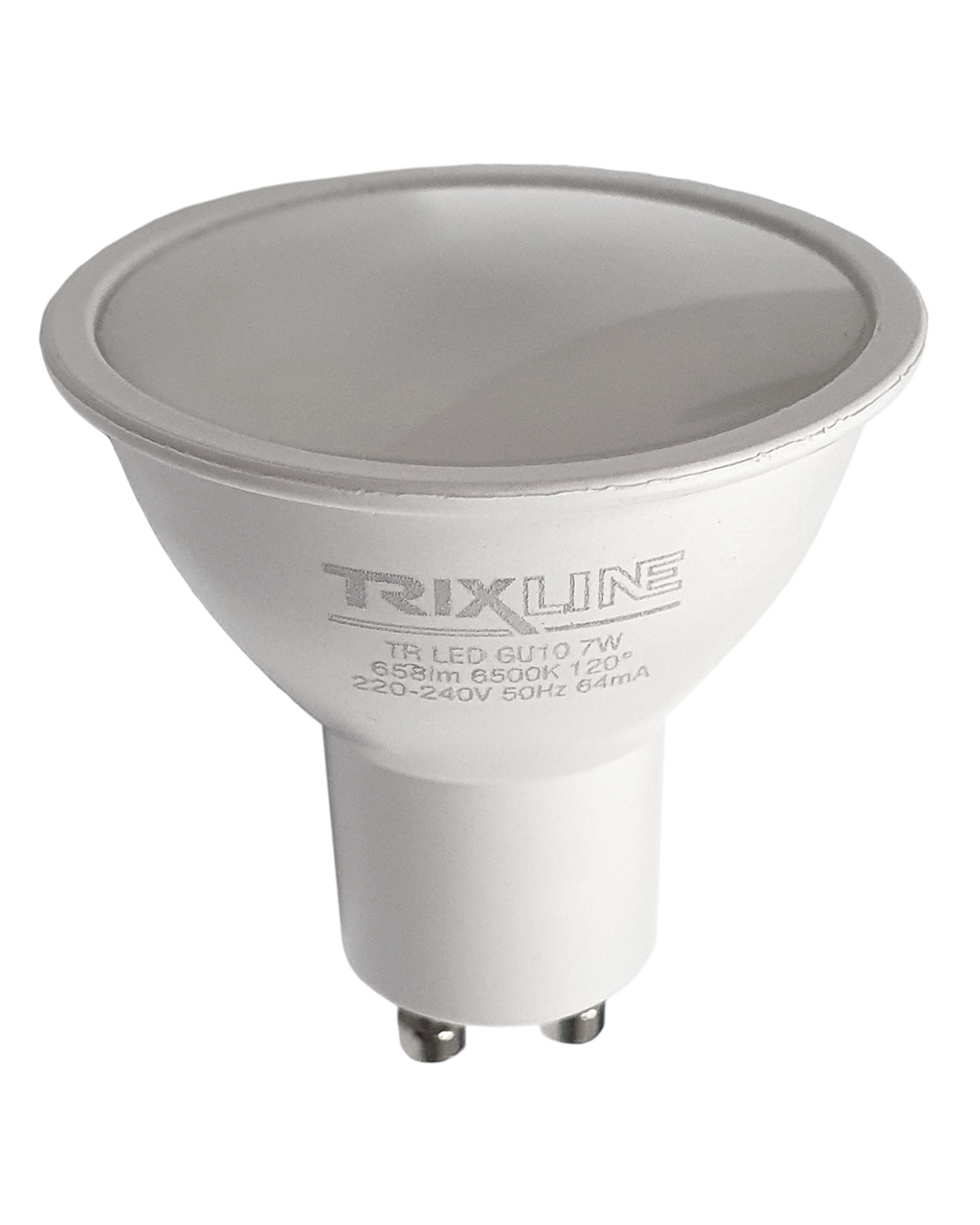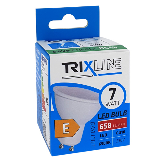 Energooszczędna żarówka LED Trixline z trzonkiem GU10, przyjazna dla środowiska, nie zawiera rtęci ani ołowiu, ponadto dobrze sprawdza się zarówno przy ekstremalnie niskich, jak i wysokich temperaturach, gdzie żarówki z włóknem często sprawiają problemy.Jej żywotność sięga aż 30 000 godzin.Dzięki swojej mocy 7W doskonale sprawdzi się jako zamiennik dla klasycznej żarówki 62W. Żarówka LED po włączeniu natychmiast się zapala bez jakiegokolwiek opóźnienia i emituje przyjemne zimne białe światło 6500K.