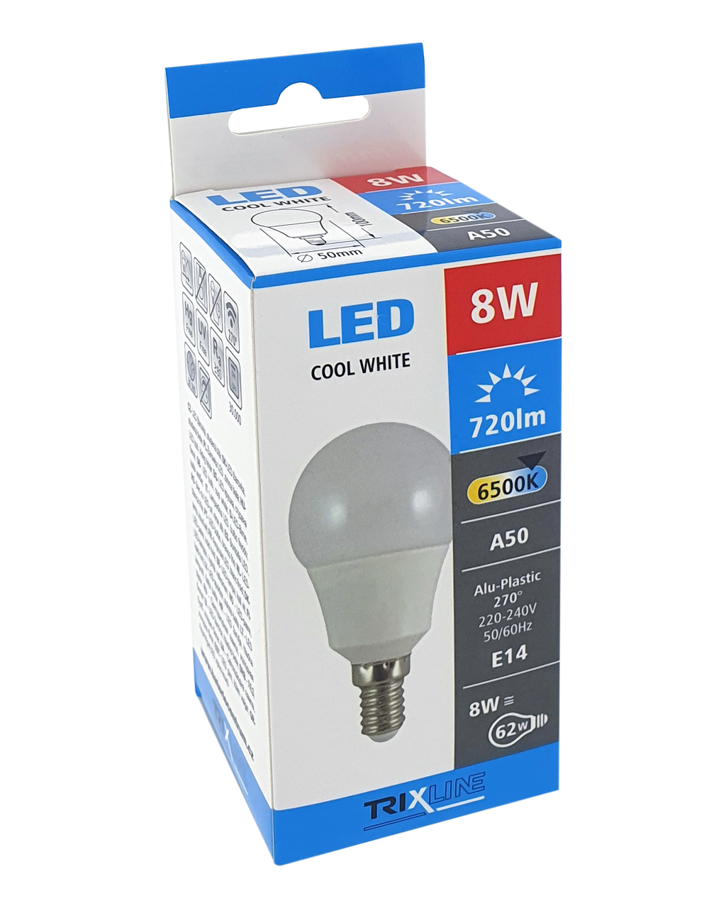ŻARÓWKA LED TRIXLINE to oszczędna żarówka LED z gwintem E14, przyjazna dla środowiska, ponieważ nie zawiera rtęci ani ołowiu, a ponadto dobrze sprawdza się w ekstremalnie niskich i wysokich temperaturach, gdzie żarówki z włóknem często mają problemy.Jej żywotność sięga aż 30 000 godzin.Dzięki swojej mocy 8 W doskonale sprawdzi się jako zamiennik dla klasycznej żarówki 62W. Żarówka LED po włączeniu natychmiast się zapala bez jakiegokolwiek opóźnienia i emituje przyjemne zimne białe światło 6500K.